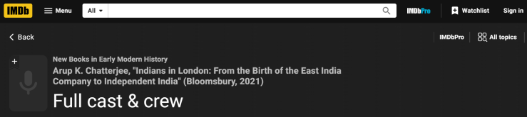 Arup K. Chatterjee’s book, Indians in London: From the Birth of the East India Company to Independent India (Bloomsbury, 2021), was featured in a 2022 podcast episode of New Books in Early Modern History, now officially listed on IMDb.