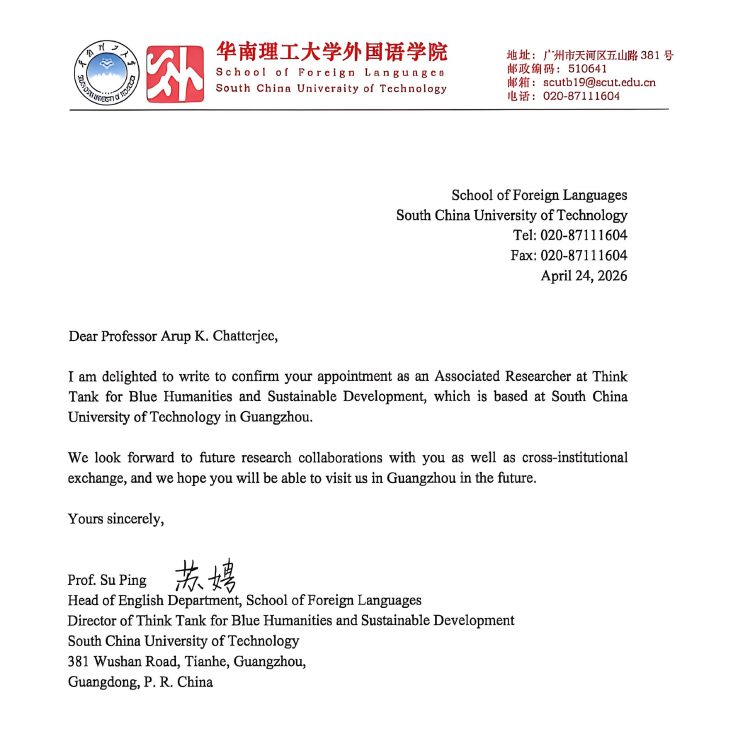 Arup K. Chatterjee has been appointed as an Associated Researcher at the Think Tank for Blue Humanities and Sustainable Development, based at the School of Foreign Languages, South China University of Technology in Guangzhou. The appointment has been confirmed in a formal letter issued by Prof. Su Ping, Head of the English Department and Director of the Think Tank. The communication is dated 24 April 2026. It records the institution’s wish for continued scholarly collaboration and cross institutional exchange. The appointment adds a further international dimension to Chatterjee’s academic work. It also places his research in conversation with a centre concerned with environmental humanities and sustainable development. The recognition reflects the growing relevance of his interdisciplinary scholarship.